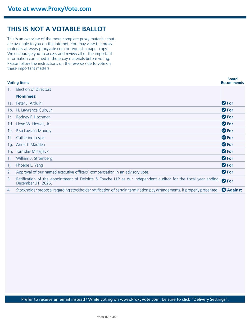 Vote at www.ProxyVote.com Prefer to receive an email instead? While voting on www.ProxyVote.com, be sure to click “Delivery Settings”. Voting Items Board Recommends V67860-P25465 THIS IS NOT A VOTABLE BALLOT This is an overview of the more complete proxy materials that are available to you on the Internet. You may view the proxy materials at www.proxyvote.com or request a paper copy. We encourage you to access and review all of the important information contained in the proxy materials before voting. Please follow the instructions on the reverse side to vote on these important matters. 1. Election of Directors Nominees: 1a. Peter J. Arduini For 1b. H. Lawrence Culp, Jr. For 1c. Rodney F. Hochman For 1d. Lloyd W. Howell, Jr. For 1e. Risa Lavizzo-Mourey For 1f. Catherine Lesjak For 1g. Anne T. Madden For 1h. Tomislav Mihaljevic For 1i. William J. Stromberg For 1j. Phoebe L. Yang For 2. Approval of our named executive officers’ compensation in an advisory vote. For 3. Ratification of the appointment of Deloitte & Touche LLP as our independent auditor for the fiscal year ending December 31, 2025. For 4. Stockholder proposal regarding stockholder ratification of certain termination pay arrangements, if properly presented. Against
